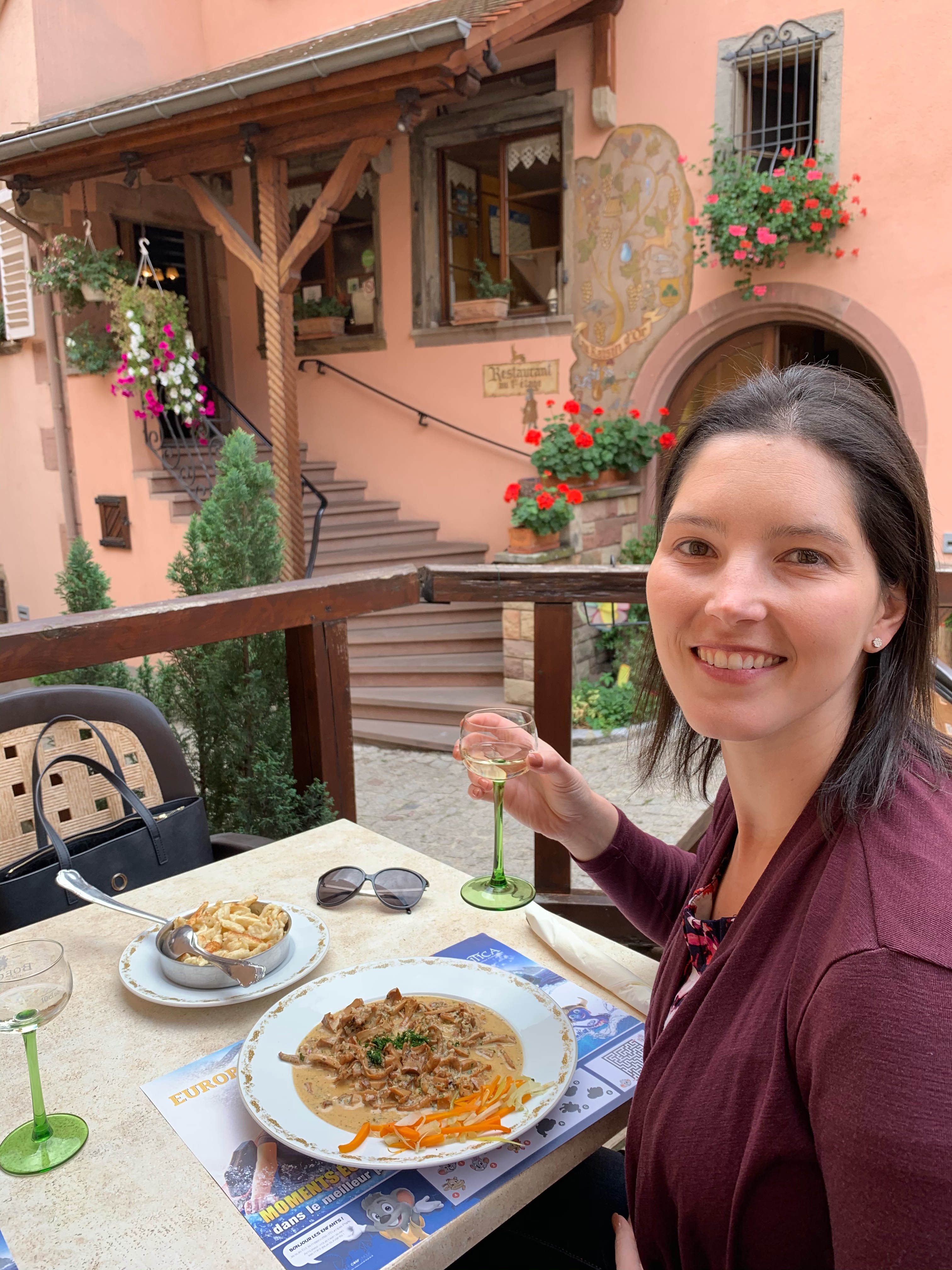 Our first meal was in an old, traditional restaurant in Strasbourg. We both chose the coq au vin, as it‘s quite different in this part of France. Whereas is most areas coq au vin is red, it turns out Alsatian coqs come with a white sauce. Having been made with Riesling.