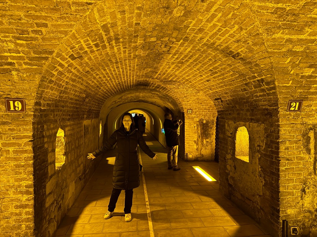 We eventually worked out, when in Epernay, in winter, what the best way to keep warm is. Thankfully it’s the same answer as in summer to keep cool, cave (cellar) tours! On one of the more interesting tours we were shown an old green glass Champagne bottle and were told how they used to be made with very high levels of Uranium oxides for colour and, for fun, would glow in the dark. Which, less fun, would also kill you. A lovely lady on the tour also pointed out that she had plates at home that glowed in the dark under a black light. Now, I don’t know why she said this, it doesn’t sound like the same thing AT ALL, but she did…so James looked at Lea, mumbled something, Lea first giggled, then scowled and shook her head (a common sequence), and James could only bite his tongue instead of offering up suggestions for what might have happened to the plates. So hard he even drew blood…ironically, his lips now also likely glow under a black light.