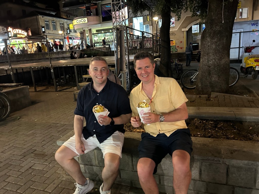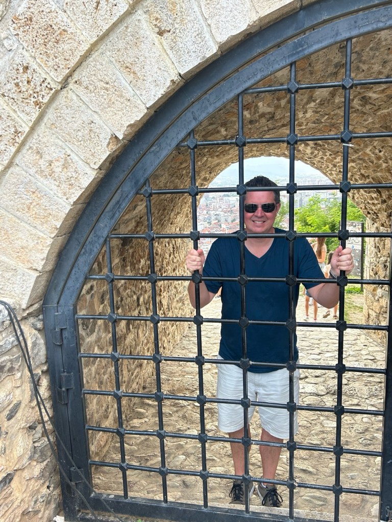 For our good deeds over 2 nights in Tirana, we were committed to a single night in Prizren, Kosovo. Nobody at the bnb, no phone coverage for any of us…no worries? Nope…some worries. Our host, thankfully, showed up, but then led us into the basement where 3 men were brandishing gas axes; helped us log on to the house wifi to get some contact with the outside world only for James’ phone to scream it’s been hacked; and then noticed each bedroom had its own shower, causing us to ruminate over the possible other uses of our apartment above a Kosovarian gym…so, some worries indeed.